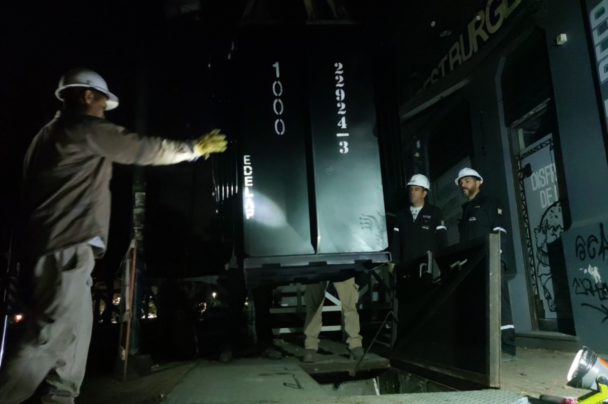 Mientras en la zona de 13 y 61 el personal desplegó maquinaria especializada para la instalación, configuración y puesta en servicio de un nuevo transformador de 1.000 kVA de última tecnología.
