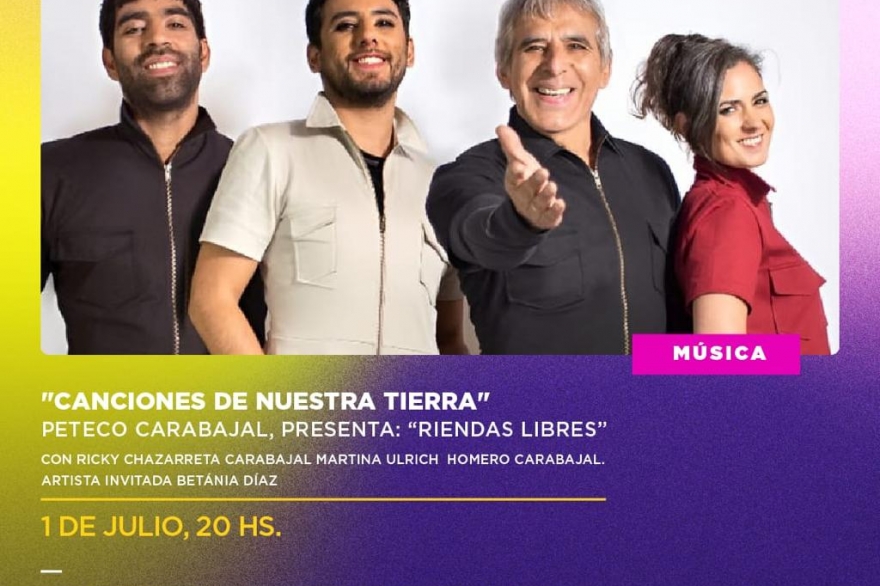 El sábado 1 de julio, a las 16, el Teatro Municipal recibirá al Concierto de Coros y Orquestas, con la actuación de La Orquesta de Don Bosco, La Sonora del Río, el Coro Lloverán Cantares y el Coro de Pony, que se reunirán para brindarnos este hermoso momento. Mientras que a las 20, se podrá disfrutar de "Riendas Libres", en el Ciclo “Canciones de Nuestra Tierra”. Un proyecto que cumple 5 años y que está integrado por Peteco Carabajal, junto a Ricky Chazarreta Carabajal, Martina Ulrich y Homero Carabajal. En esta fiesta de chacareras y folclore argentino tendrá la participación de Betania Díaz, la destacada cantante nacional.