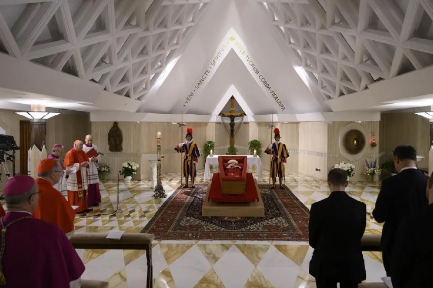 Las imágenes, difundidas a través de los canales oficiales de la Santa Sede, muestran al Papa dentro de un austero féretro de madera clara, dispuesto en la Capilla de Santa Marta, la residencia donde eligió vivir desde el inicio de su pontificado y que mantuvo como hogar hasta sus últimos días. El ataúd, abierto y sin el uso del tradicional catafalco, es una representación tangible de su estilo de vida: sobrio, modesto y siempre alejado del boato.