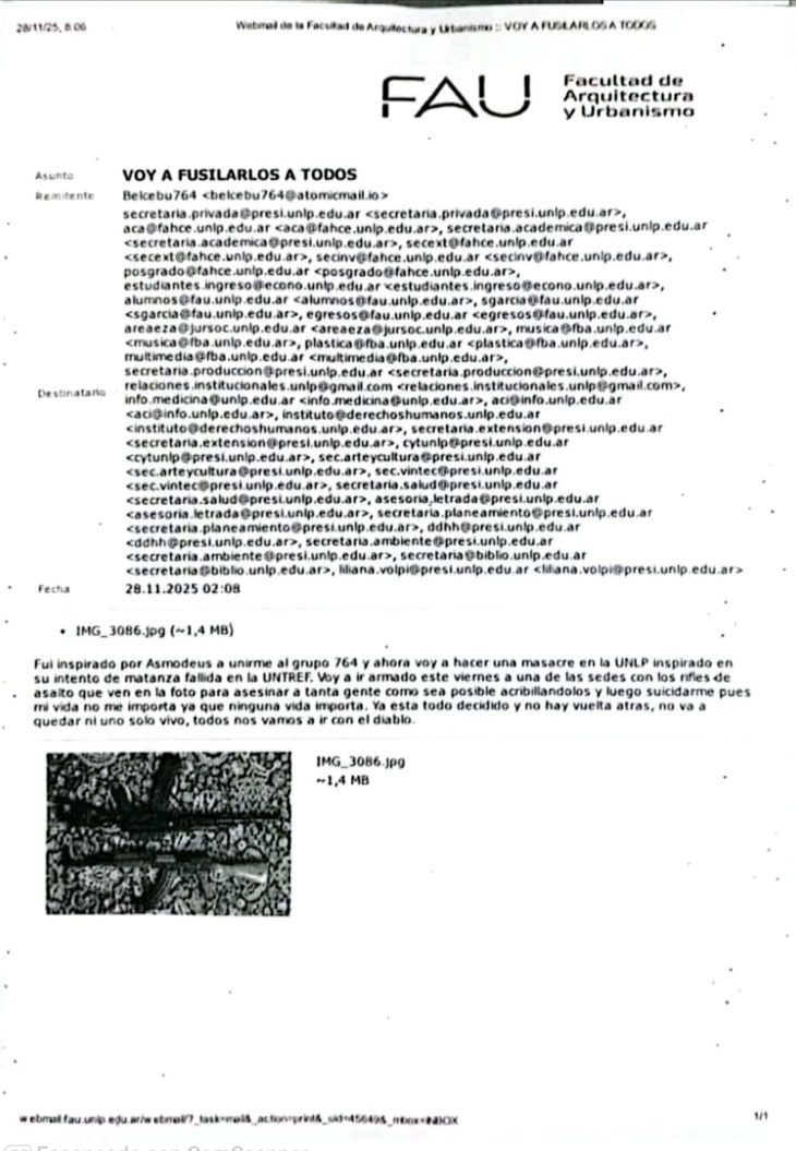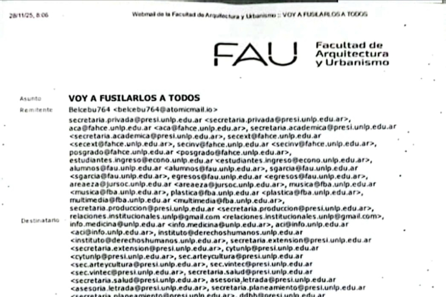 Un correo a distintas facultades de la UNLP amenazando con una "masacre"